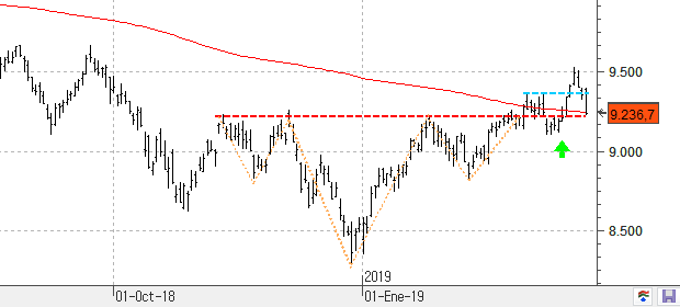 El Eurostoxx 50 ha mejorado sustancialmente su aspecto técnico desde que comenzara 2019. El selectivo europeo ha conseguido subirse ampliamente por encima de la media de 200 sesiones lo que confirma un cambio de tendencia. Tras unas revalorizaciones del 17% desde los mínimos de finales de 2018 lo más normal es que veamos un alto en el camino, que al igual que en el Ibex 35, se podría interpretar como una sana corrección. Como el selectivo español podríamos estar viendo la formación de un throw back a este promedio por lo que parece factible que pudiéramos acabar viendo una continuación de las ganancias hasta el nivel de los 3.168 puntos.