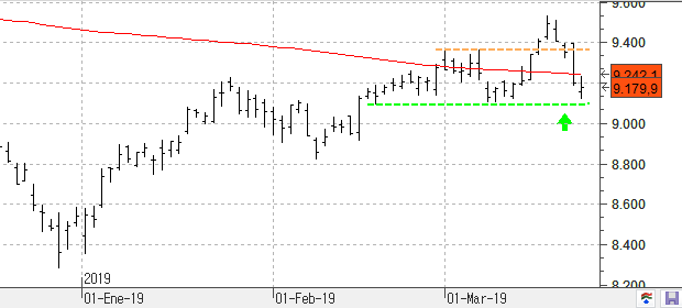 El Ibex 35 termina con leves descensos del 0,21% y consigue sujetarse, por el momento, en las inmediaciones del soporte de los 9.100 puntos. Es importante que no pierda este nivel de demanda y que vuelva a subirse por encima de la media de 200 sesiones. No obstante para confirmar un cambio de tendencia deberíamos esperar a un cierre por encima de los 9.532 puntos. Esta sería señal que nos haría pensar en un cambio de tendencia.