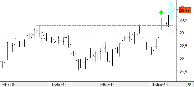 Nueva señal de fortaleza en Endesa que da una nueva señal de fortaleza al pulverizar la resistencia de los 23,60 euros. Con esto se confirma la formación de un throw back al nivel de los 23,30 euros y parece muy probable que acabemos viendo una continuación de las subidas hasta el nivel de los 27 euros, precios que podría alcanzar en las próximas semanas.