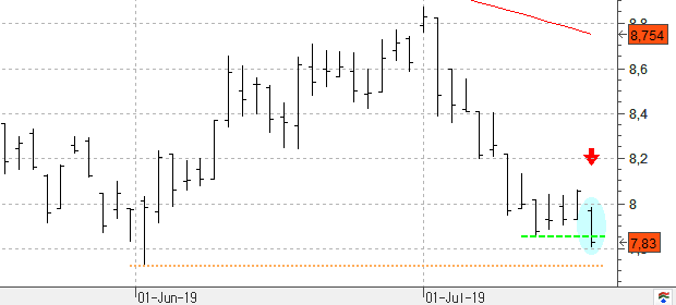 Acerinox cae un 2,78% y pierde el soporte de los 7,86 euros. Muy pendientes que la compañía se acerca al soporte de los 7,72 euros, mínimos anuales. Mucho cuidado con la pérdida de este nivel de demanda nos confirmaría una continuación de los descenbsos hasta el nivel de los 6,60 euros, niveles de 2016.