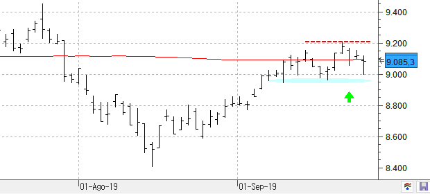 Leves descensos del 0,36% en el Ibex 35 que termina rebotando tras acercarse al nivel de los 9.000 puntos. La resistencia clave del corto plazo se encuentra en los 9.210 puntos. Si consigue superar este nivel de precios es muy probable que acabemos viendo una continuación de las subidas hasta el nivel de los 9.453 puntos. No veremos una señal de debilidad mientras que se mantenga cotizando por encima de los 8.963 puntos.
