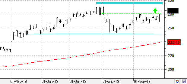 Muy buena señal la que pudimos ver este pasado viernes en Adidas que terminó la semana superando la resistencia clave de los 280,25 euros. Atentos que la compañía confirma el final de los descensos y parece más que probable que acabemos viendo un ataque a los máximos históricos que presenta en los 296,75 euros. Su comportamiento en este nivel de precios es clave y es que si al final consigue superarlos veríamos como el valor consigue meterse en subida libre con todo dispuesto para que acabemos viendo una extensión de las ganancias hasta el nivel de los 330 dólares. Los buenos niveles de acumulación nos hacen más que reforzar su tendencia alcista actual y es que no apreciaremos ni la más mínima señal de fortaleza mientras que se mantenga cotizando por encima de los 253,20 dólares, mínimos del pasado mes de agosto.