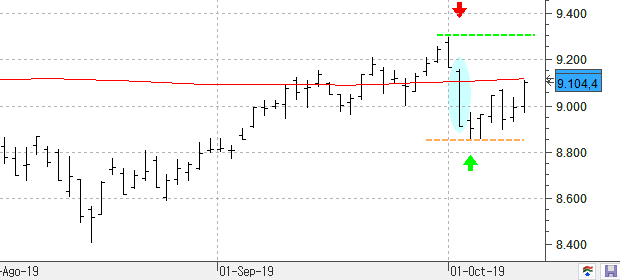 Ganancias del 1,25% en el Ibex 35 que consigue cerrar por encima de los máximos del martes. A pesar de las subidas de este jueves debemos tener muy presente que se mantiene la figura bajista del pasado día 2. La resistencia clave se encuentra en los 9.300 puntos y no veremos una señal de fortaleza mientras que se mantenga cotizando por debajo de este nivel de precios. Por debajo el soporte clave se encuentra en los 8.850 puntos.
