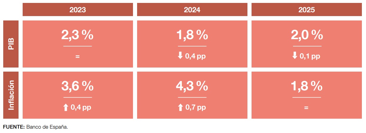 Por otro lado, en cuanto a la inflación, el Banco de España revisa al alza la tasa general para el presente ejercicio y el siguiente, colocando el Índice de Precios de Consumo (IPC) en el 3,6% y 4,3%, respectivamente, lo que supone cuatro y siete décimas más. Sigue manteniendo que descenderá hasta el 1,8% en 2025.